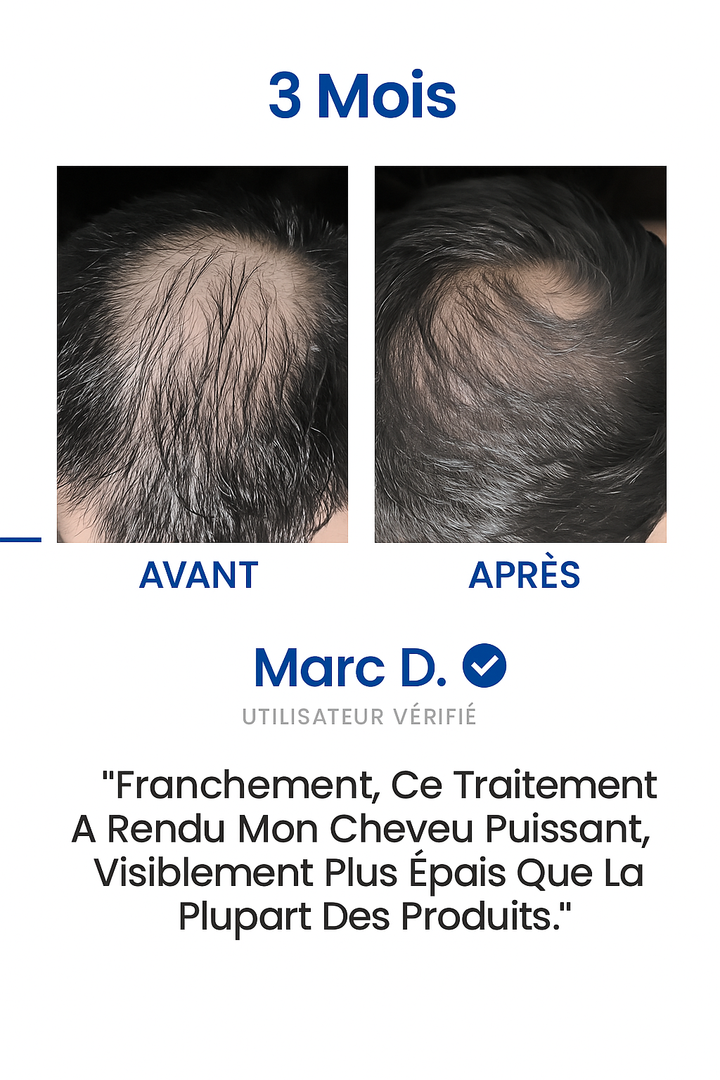 Incroyable ! Mes cheveux étaient fins et ternes, et je pensais que c'était sans espoir. Après quelques semaines, je constate une nette amélioration. Moins de cheveux sur la brosse, et surtout, ils sont plus épais et brillants. L'application est super facile. Je le recommande à tous ceux qui veulent retrouver une belle masse capillaire sans effort !